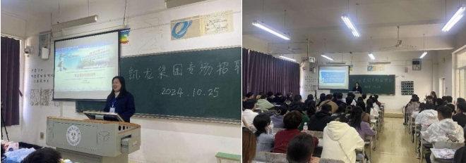 在公司專場宣講會現(xiàn)場,130多名應(yīng)屆畢業(yè)生如約而至,其中涵蓋不少凱龍班及2024年暑期實習(xí)實訓(xùn)的學(xué)生。宣講會以公司形象宣傳片作為開場,形象展示了凱龍集團的歷史沿革、發(fā)展現(xiàn)狀以及未來愿景。隨后,集團公司人政處副處長陳榮輝向同學(xué)們介紹了公司的薪酬福利、人才政策、晉升通道以及招聘需求等方面的內(nèi)容。